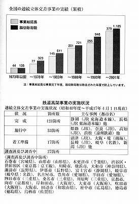 例えば東京の環状7号線とかいう道路と線路の踏切りのはずです。連続立体交差事業の採択基準では,踏切は交通渋滞が激しく,踏切事故が多発する道路を対象にしているもので,自動車の通らない農道や私道が対象ではないでしょう。踏切りの13箇所を効果に入れるのは,言い過ぎだと言う感じがします。