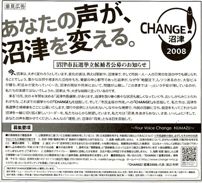 沼津市政の変革を求める市民団体「CHANGE!沼津2008」(渡辺利明代表)は四日、次期市長選(十月二十八日投開票)で擁立する候補者を公募すると発表した。三十一日に締め切り、八月初旬に決定するという。